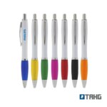 Bolígrafo con cuerpo curvo plástico en acabado blanco. Cuenta con grip de goma de color, clip y botón metálico, mecanismo retráctil y tinta negra.